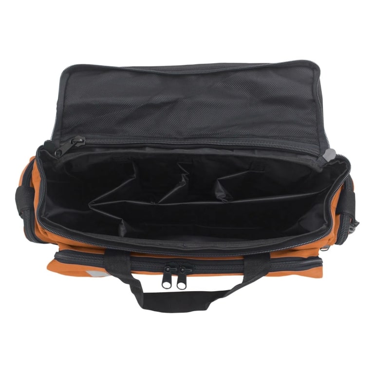 – Possui divisórias internas que podem ser removidas e recolocadas com botão de pressão, cintos elásticos para transporte de materiais e bolso em tela com abertura em zíper;