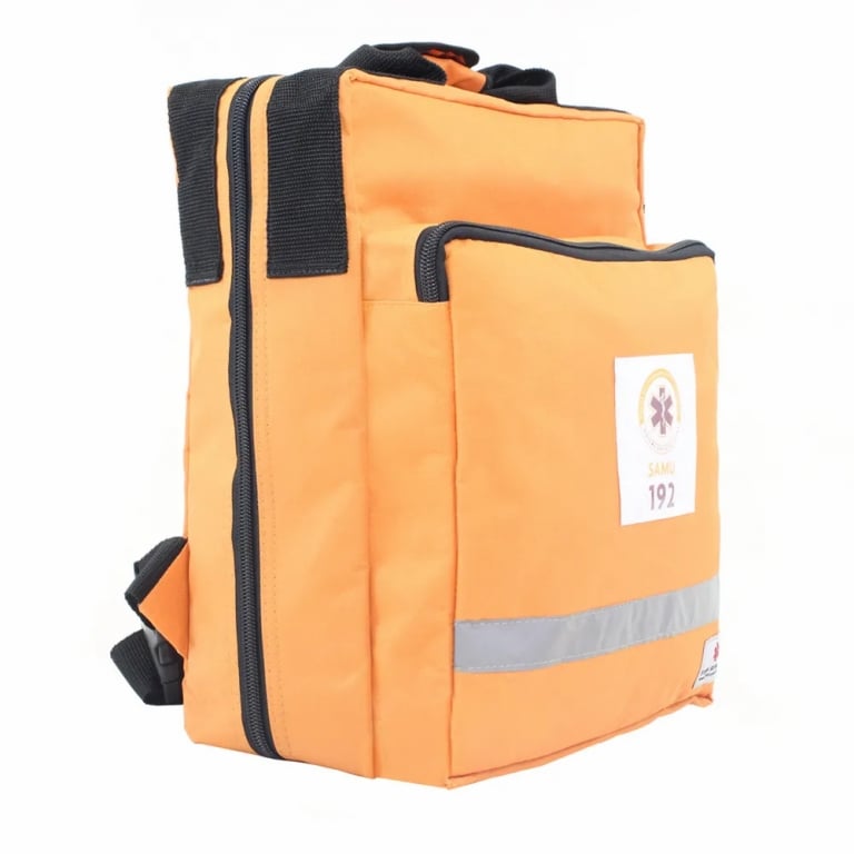A bolsa mochila foi desenvolvida para auxiliar e facilitar o trabalho dos socorristas. Possui logotipo do Samu e é indicada para transportar itens utilizado em atendimentos de resgate e salvamento. Com divisórias e elásticos para fixação em seu interior.