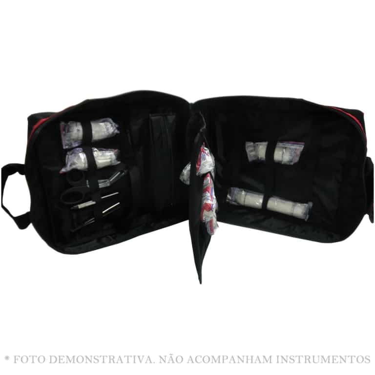 – Parte interna: possui cintos elásticos para fixação de materiais em 01 cartela removível, além de cintos e bolsos fixos com fechamento em zíper;